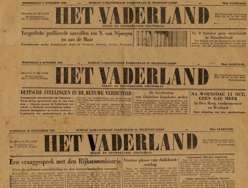 Drie exemplaren van jaargang 76 van 'Het Vaderland' van 30 september en 4, en 5 oktober 1944.