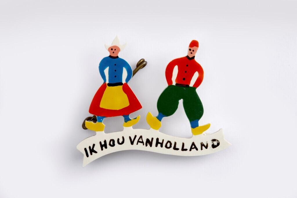 Een broche met de in hout uitgesneden afbeelding van een boer en boerin in Nederlandse klederdracht met daaronder: "Ik hou van Holland".
