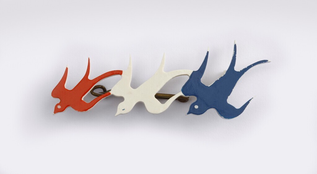 Een broche met drie in hout uitgesneden zwaluwen geverfd in de kleuren van de Nederlandse vlag.