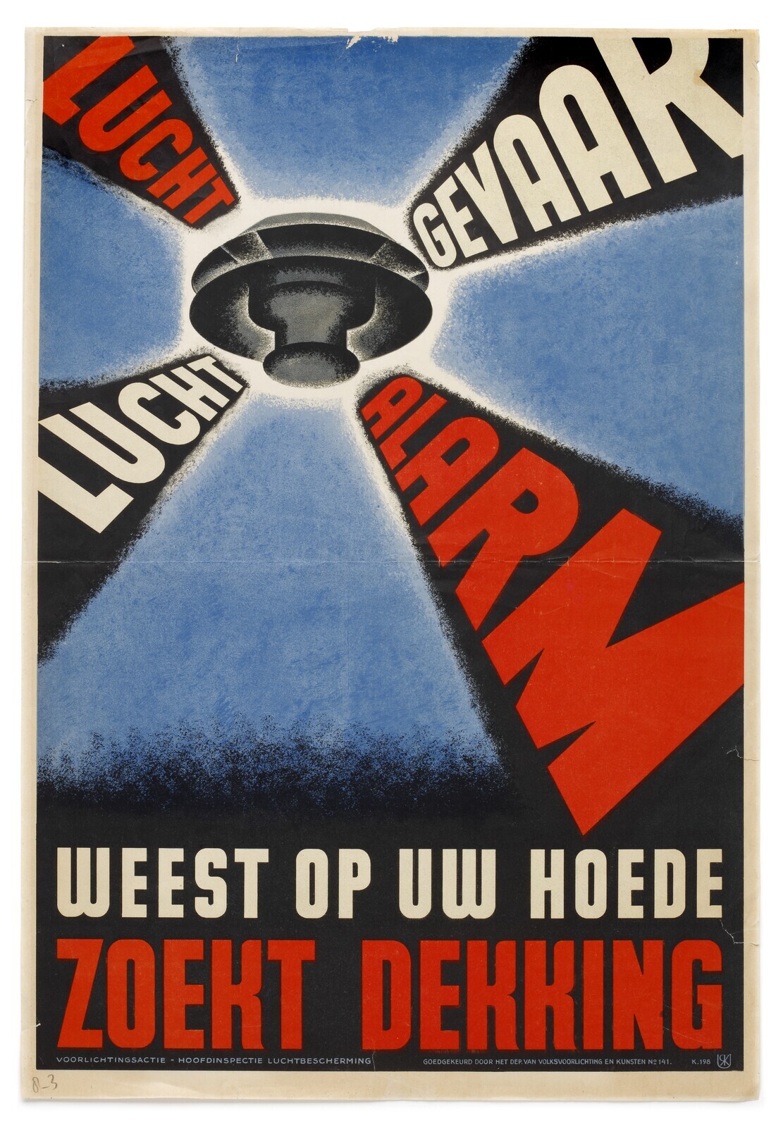 Een affiche in rode, zwarte en blauwe opdruk waarmee gewaarschuwd wordt voor bombardementen. Afgebeeld is een sirene tegen een blauwe achtergrond met onderaan: "Weest op uw hoede. Zoekt dekking".