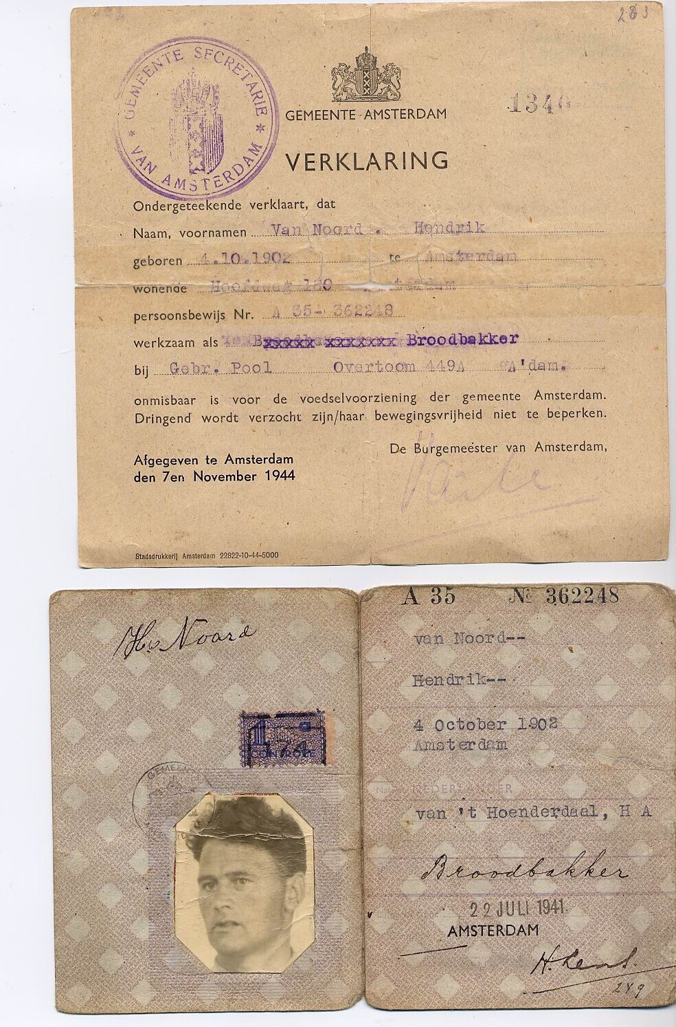 Tien persoonlijke documenten van de heer H. van Noord (4-10-1902) uit de bezettingstijd: een persoonsbewijs, een verklaring voor ontheffing van de arbeidsinzet, een militair zakboekje, een nummerbewijs voor motorrijtuig, drie reisvergunningen in het Duits, een verklaring voor de noodzaak van het bezitten van een rijwiel, en twee foto's.