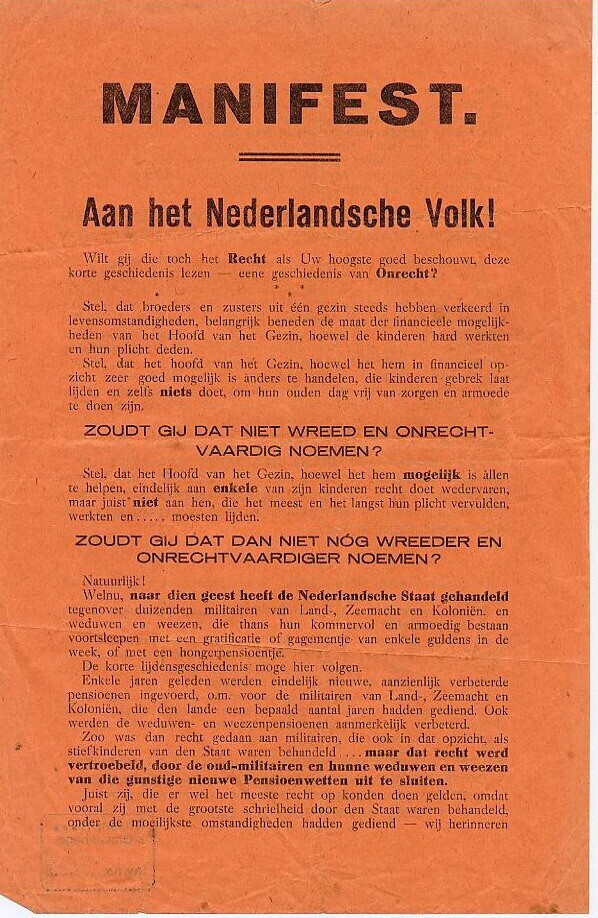 Oranje pamflet dat protest aandient over de slechte pensioenvoorziening van Nederlandse oud-militairen.