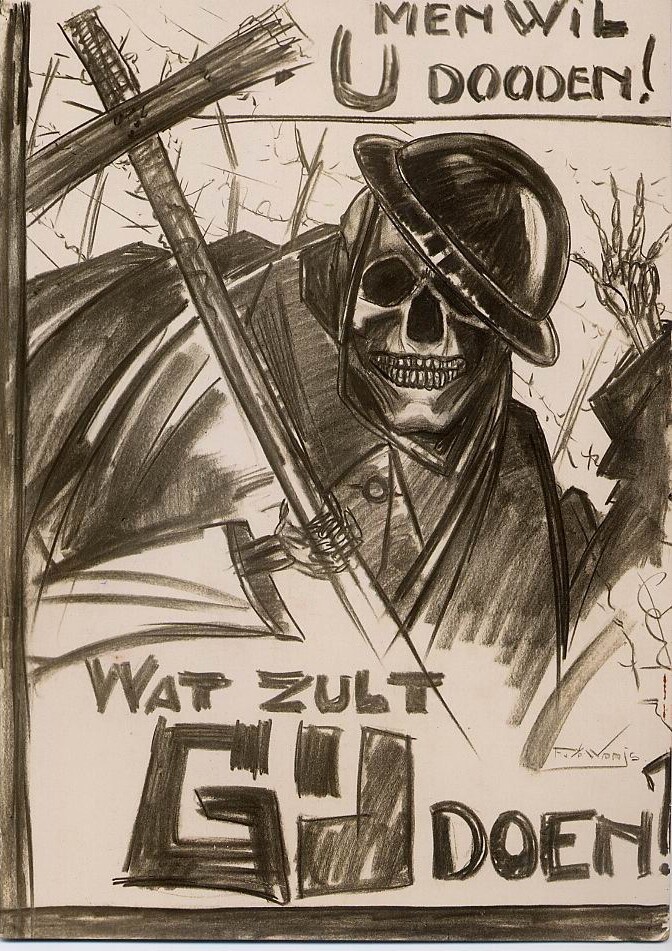 Een fotokaart met de afbeelding van een zwartwit tekening van een skelet in militair uniform in een loopgraaf en een kruis in de hand. Op de achterkant een stempel: "Ten bate ener te houden Esperanto-anti-oorlog Tentoonstelling".