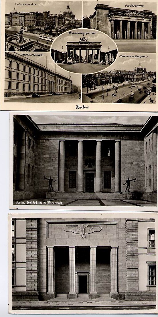 Drie onbeschreven briefkaarten met zwart-wit foto's van Berlijnse gebouwen met Nazi symbolen. Twee briefkaarten met afbeeldingen van de Rijkskanselarij. Een briefkaart met vijf foto's van Das Ehrenmal, Schloss und Dom, de Rijkskanselarij en de Brandenburger Tor.