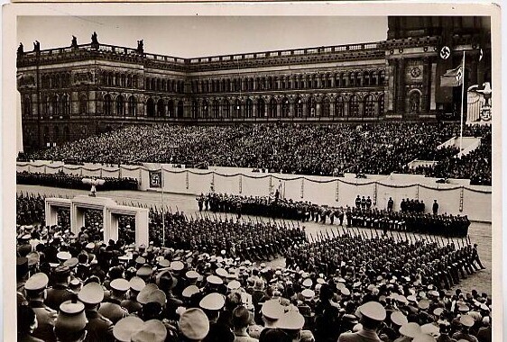 Een onbeschreven briefkaart met een zwart-wit foto van een Wehmacht parade ter gelegenheid van Hitlers verjaardag op 20 april 1939.