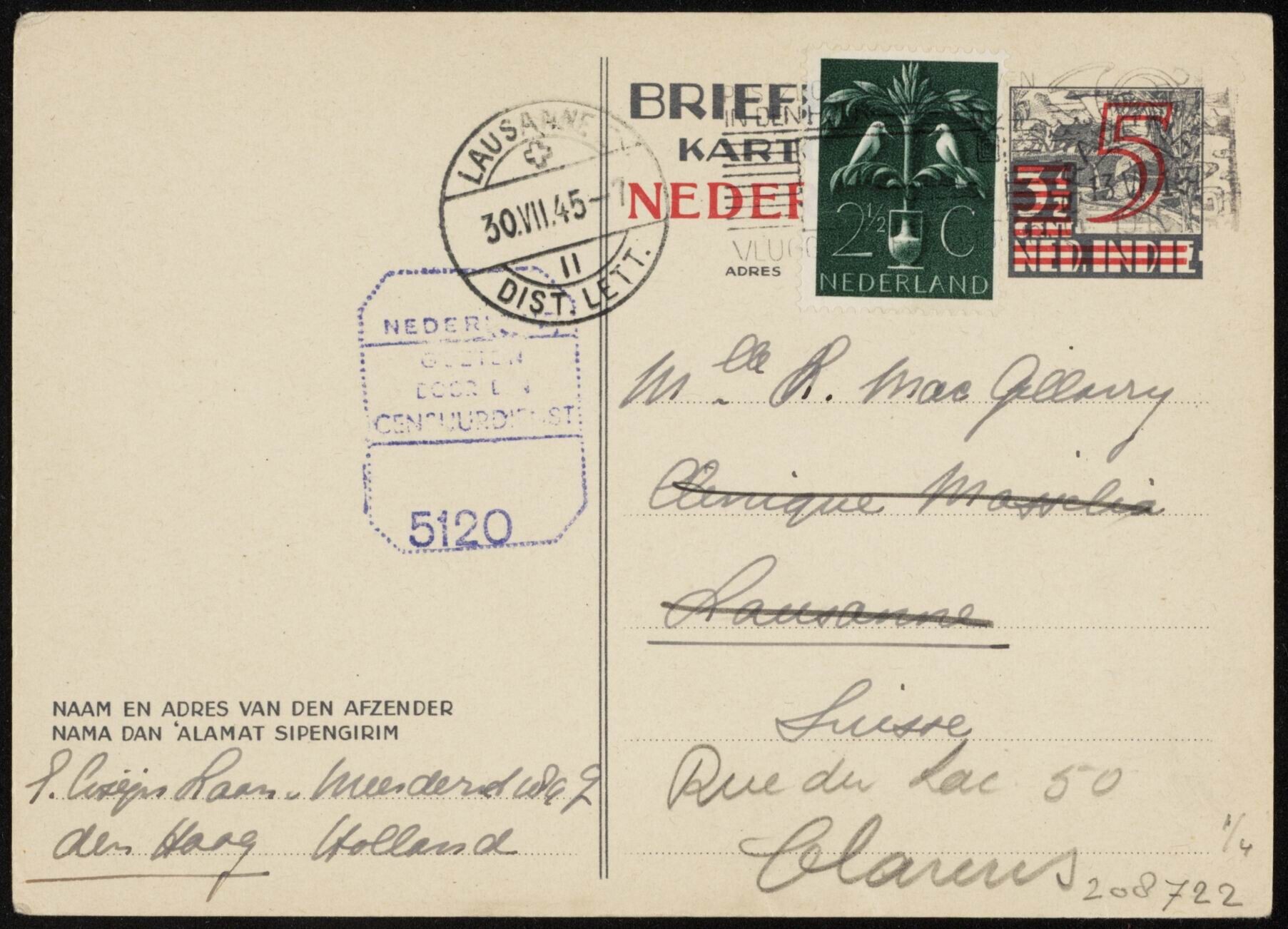 Vier briefkaarten van S.(?) Cosijn, Laan van Meerdervoort 189 g te Den Haag. Drie verzonden aan mejuffrouw A. Broers van Dort te Zwitserland op 16 Juli 1945, 22 juli 1945 en 29 Juli 1945. Een vierde is verzonden aan mejuffrouw. R. Mac. Gellairy(?) op 13 Juli 1945. Drie van de briefkaarten zijn voorzien van een stempel van de censuur.