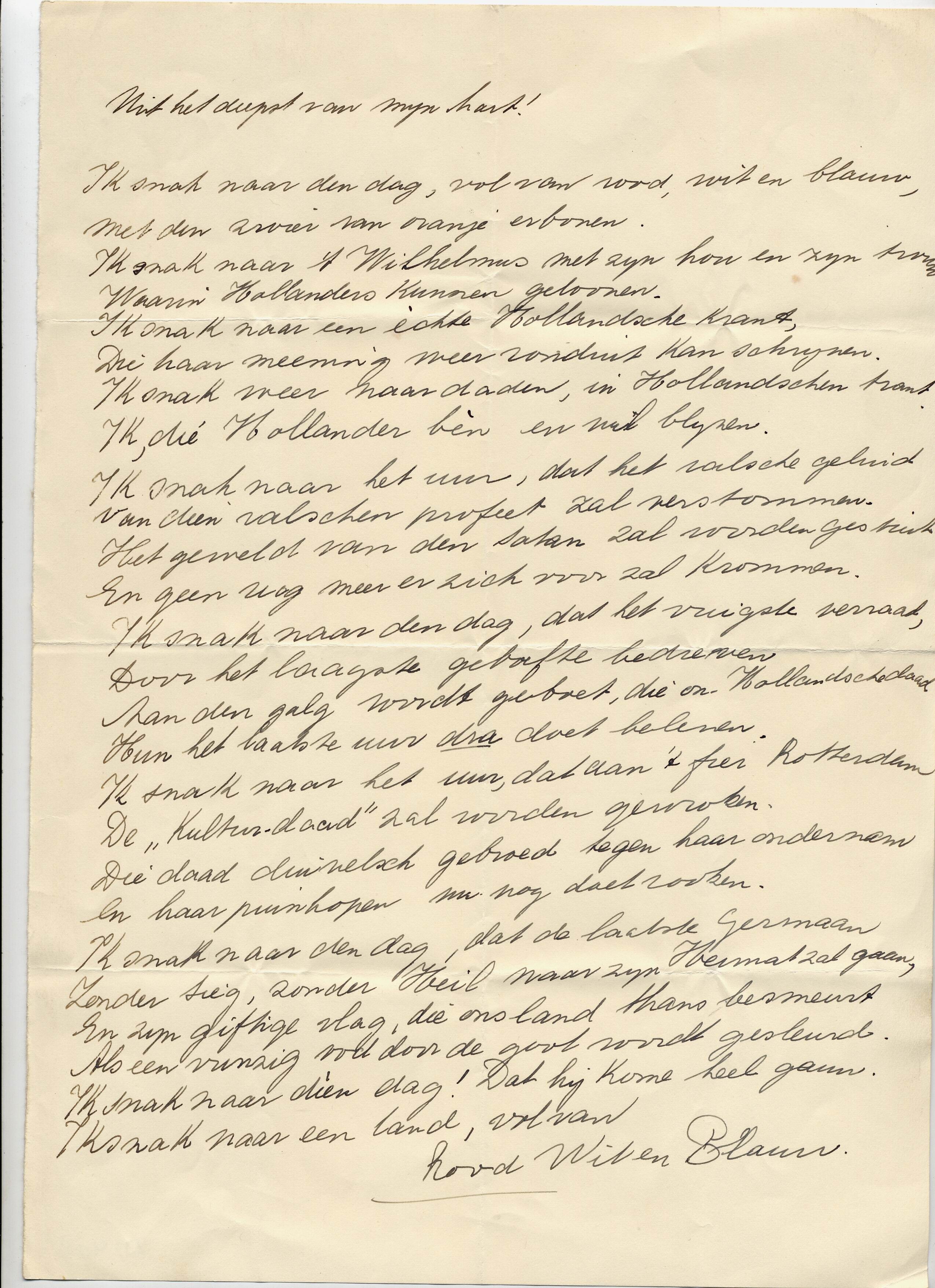 Een anti-Duits gedicht waarin de anonieme schrijver het sterke verlangen uitspreekt naar een weer onafhankelijk Nederland: "Vol van Rood Wit en Blauw".
