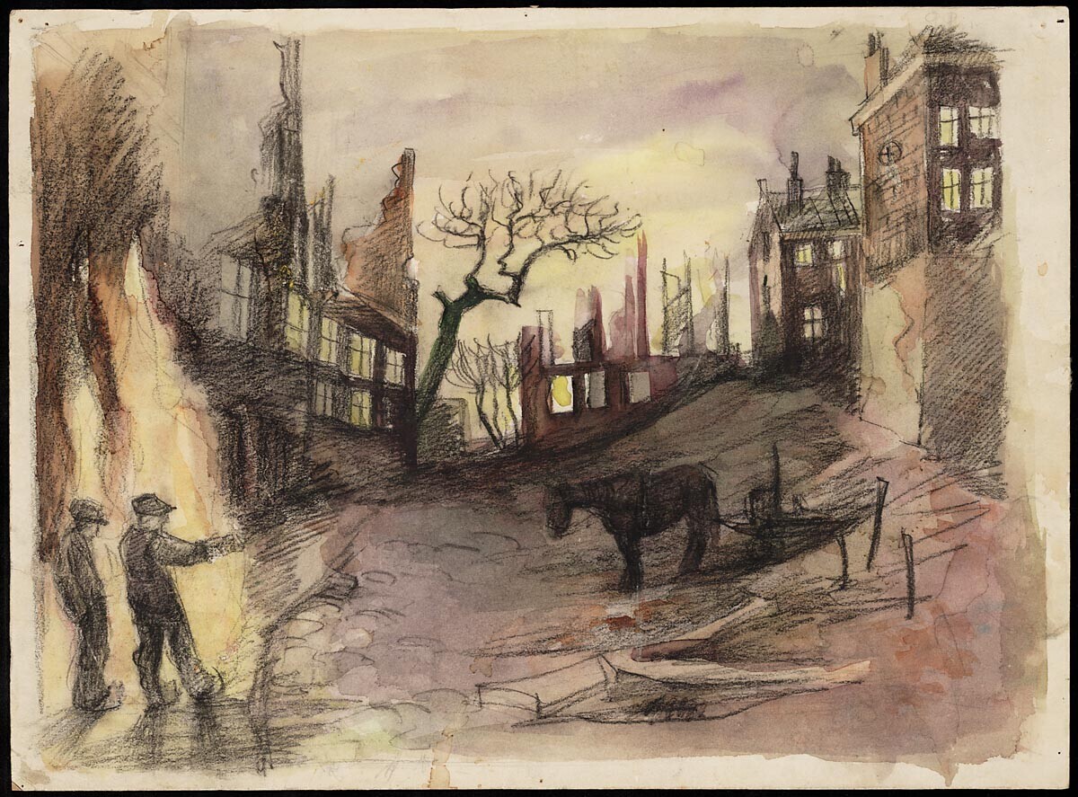 Een houtskooltekening met aquarel ingekleurd van een straat waarvan een deel van de bebouwing in puin ligt na een bombardement. In het midden een kale boom die dit accentueert. Op het midden plan, iets rechts van het midden een paard met een kleine kar en links op de voorgrond twee mannen op klompen. Rechts enkele intact gebleven huizen waar licht door de ramen schijnt. Geen signering.