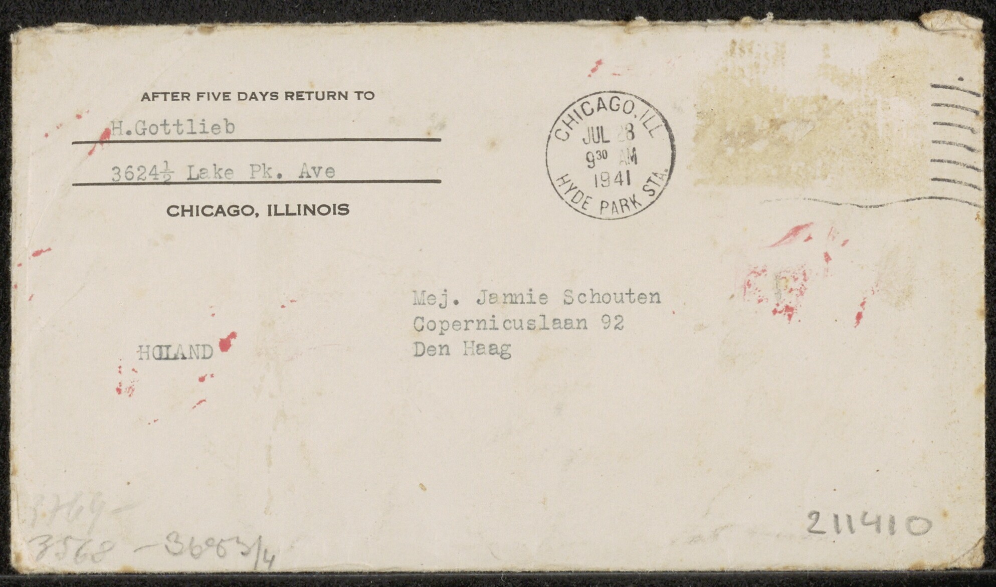 Een getypte brief die Esther Gottlieb tijdens de Tweede Wereldoorlog stuurt aan haar Haagse vriendin Jannie Schouten. De brief is door de Duitse censuur gecensureerd. Esther en haar man Heinz zijn waarschijnlijk Joodse vluchtelingen. Ze schrijft dat ze na veel moeilijkheden bij elkaar zijn gekomen. Ze vertelt daarbij niet waar die moeilijkheden uit bestonden. De teneur van de brief is dat politiek en de oorlogssituatie bewust worden vermeden in verband met de censuur. Wel geeft de schrijfster een sprekende beschrijving van de verschillen in de Amerikaanse en Nederlandse leefstijl die ze heeft opgemerkt sinds ze een tijdje in Chicago woont. Ook het gezinsleven met haar man en haar pasgeboren kind Pearl komt aan bod. De brief omvat drie losse pagina's. Met bijbehorende envelop met poststempel van Chicago Illinois.