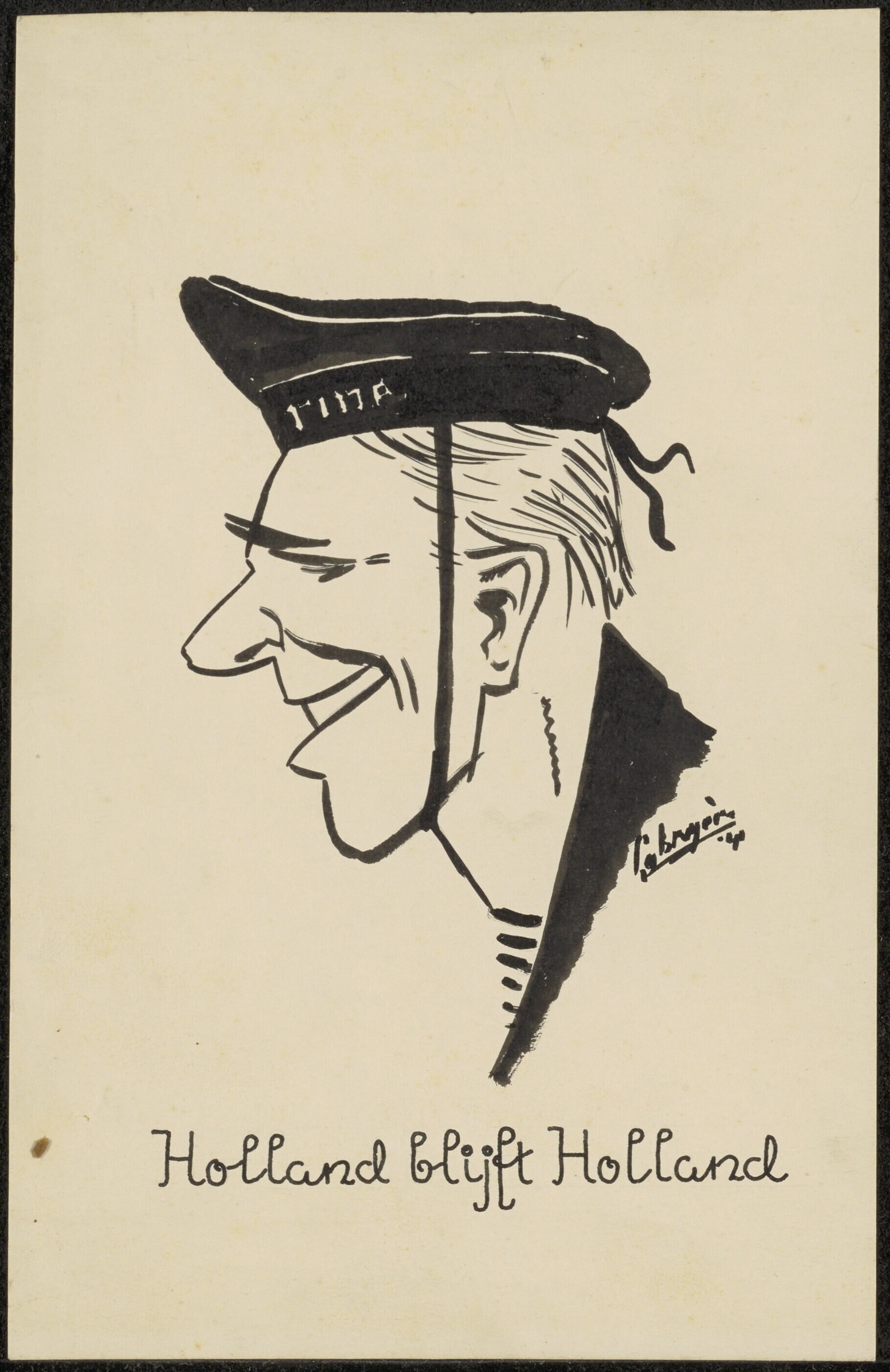 Een tekening in zwarte inkt van een lachende matroos van links gezien en profiel afgebeeld met de titel: "Holland blijft Holland".