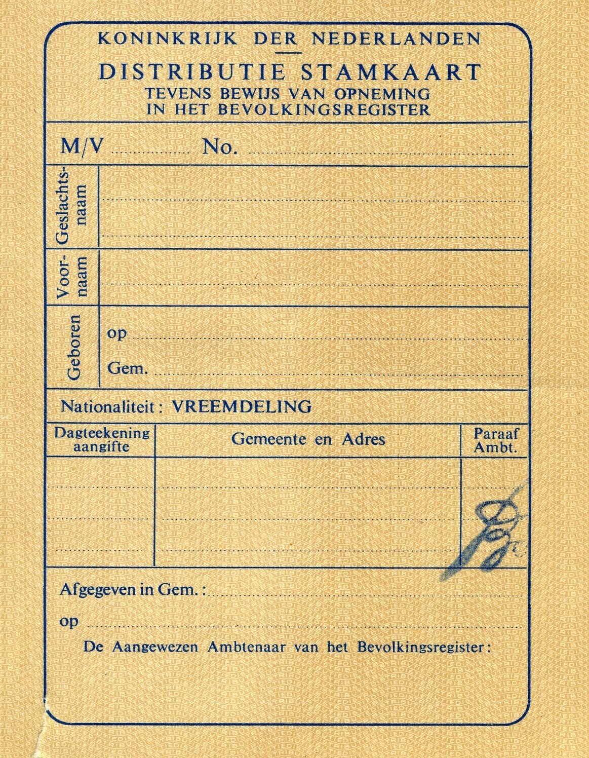 Blanco distributiestamkaart met paraafstempel van de ambtenaar. Mogelijk gebruikt door het verzet.