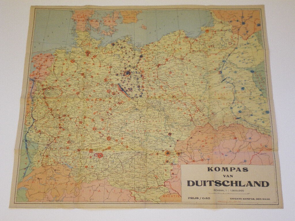 Een landkaart van Duitsland, waarbij de grenzen aangegeven worden, zoals deze waren op 1 september 1939. Rechtsonder staat in een kader: "Kompas van Duitschland schaal 1 : 1.900.000 prijs f 0.65 uitgave kompas, Den Haag Grenzen van 1 sept 1939". Op de kaart zijn met blauwe en rode potlood stippen gezet en lijnen getrokken. Op de achterkant van de kaart staat twee maal in pen: "Oorlogskaart van Duitsland 1940 - 1945".