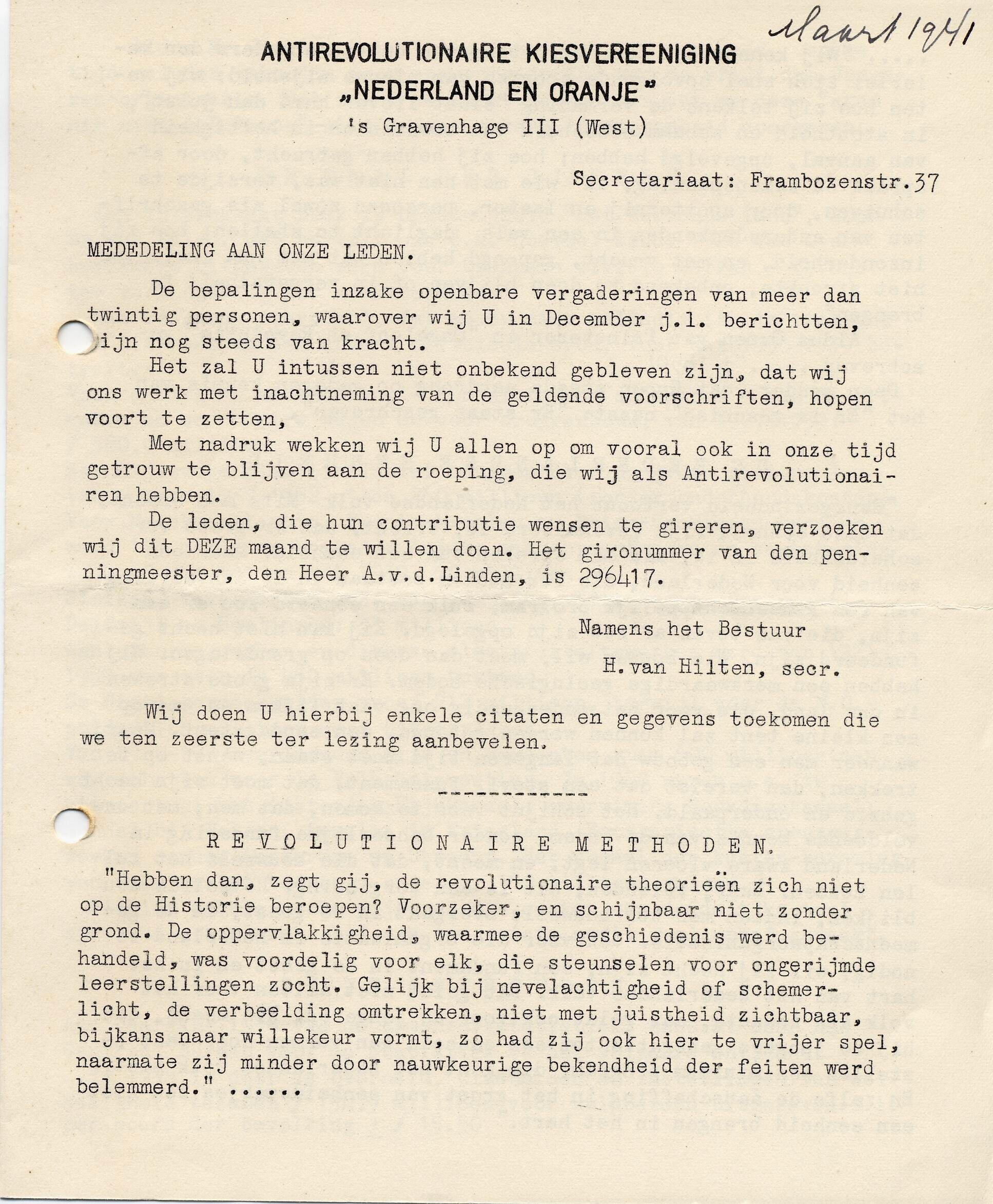Een rondschrijven met citaten van Groen van Prinsterer en andere prominenten om de leden van de ARP een hart onder de riem te steken. Een openbare vergadering met meer dan twintig personen mag niet worden gehouden. Het schrijven is bestemd voor afdeling III, Den Haag (West).