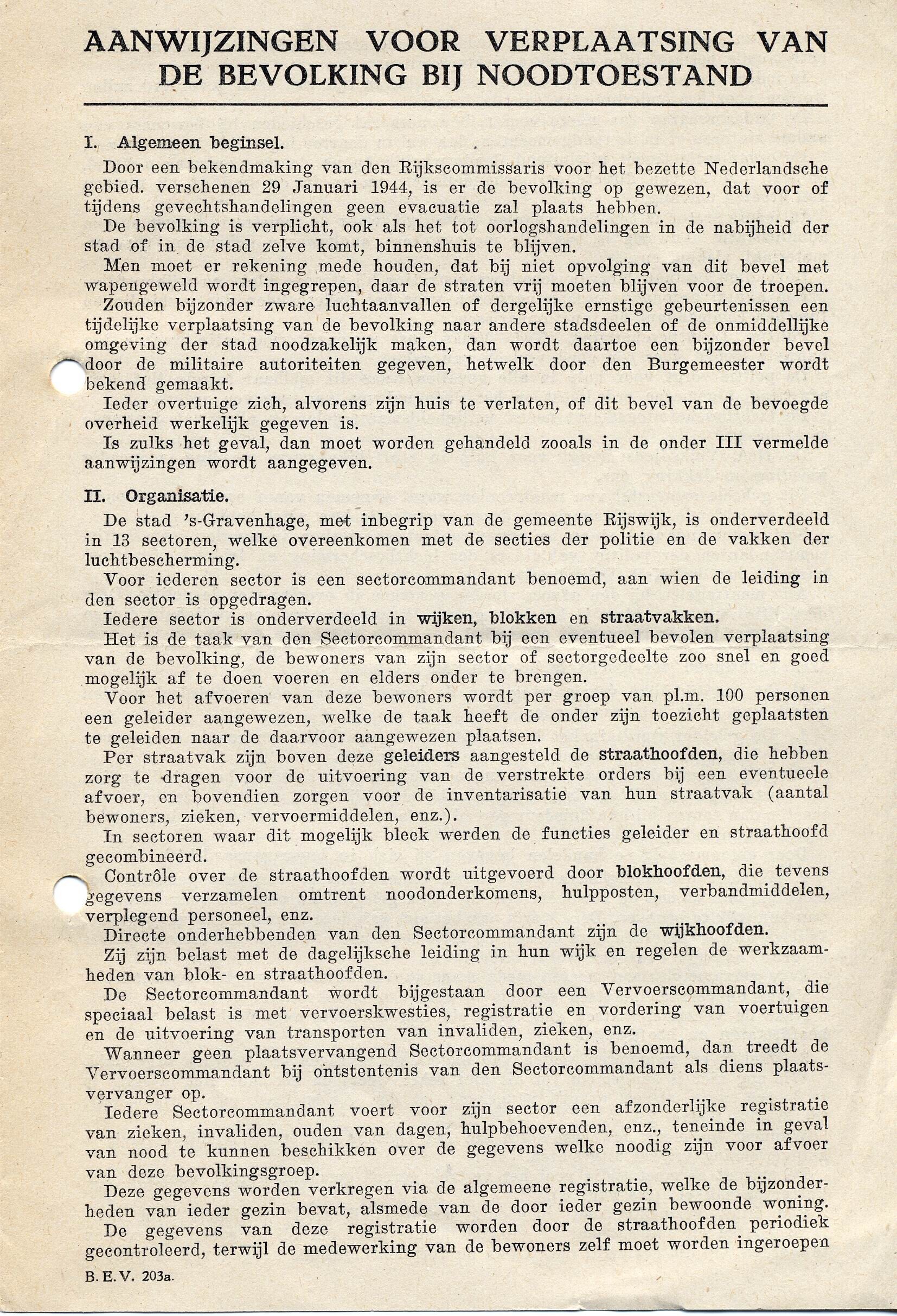 Instructies voor de verplaatsing van de Haagse bevolking in het geval van een noodevacuatie. Aangegeven wordt via welke straten men de stad moet verlaten.