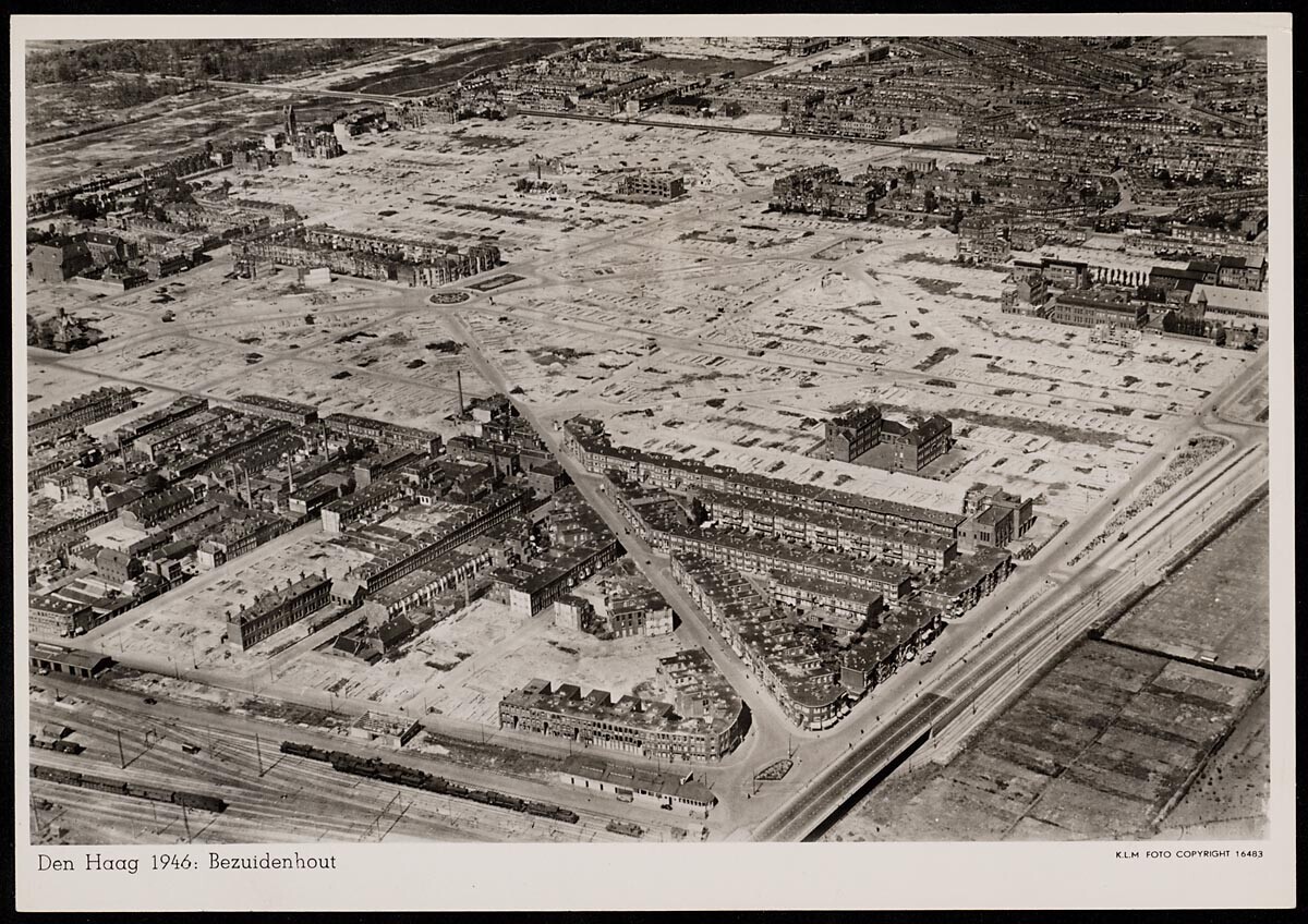 Een luchtfoto in zwart en wit van het Bezuidenhout. Onder de foto: "Den Haag 1946: Bezuidenhout. K.L.M. foto copyright 16483". Op de achterkant: "Aerial photograph. K.L.M. Royal Dutch Airlines. All rights reserved".