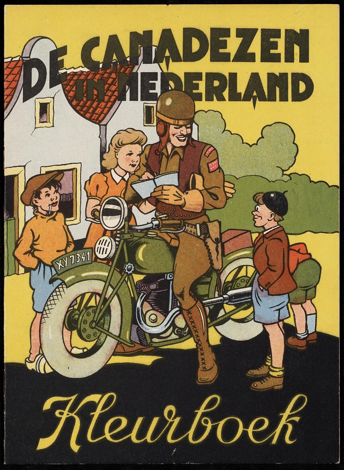 Een kleurboek met vijf prenten van Canadese militairen met kinderen die ingekleurd kunnen worden.