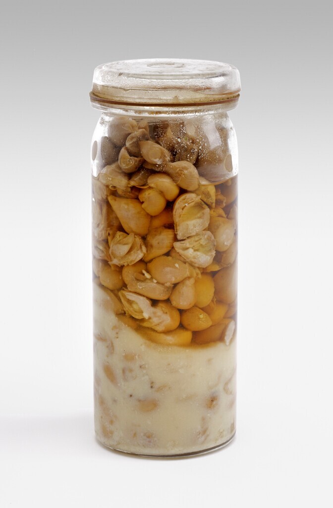 Een ronde glazen weckfles met tulpenbollen in conserveringsvloeistof. Op het deksel van de weckfles: "Vijzel conservenglas" en een afbeelding van een vijzel.