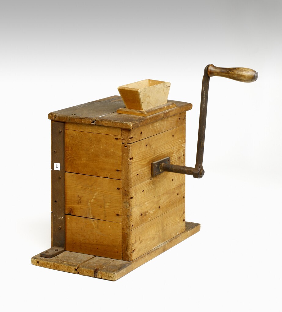 Een houten graanmolen op een houten plank met een metalen slinger verbonden aan een maalmechaniek.