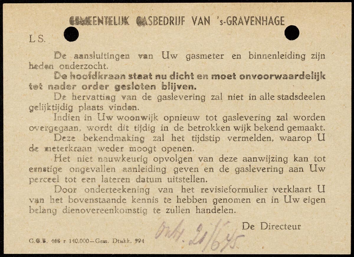 Twee mededelingen van het gemeentelijk gasbedrijf Den Haag: <br>a) de aansluitingen zijn onderzocht en de hoofdkraan moet voorlopig afgesloten blijven (21 juni 1945); <br>b) een rondschrijven van het gemeentelijk gasbedrijf uit juli 1945 over de hervatting van de gaslevering.