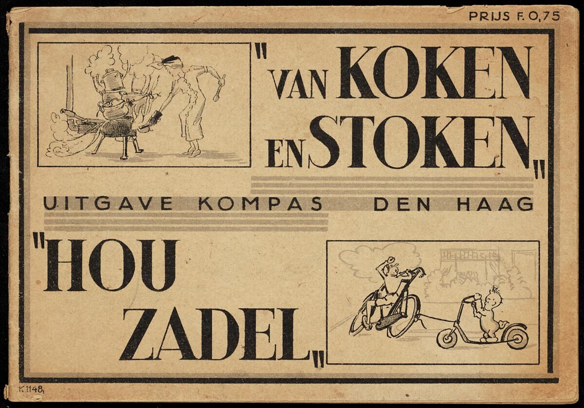 Een dun drukwerk met op de kaft een tekening van een kokende vrouw met daarnaast; "Van Koken en Stoken" en een tekening van een fiets, die een step voorttrekt met daarnaast: "Hou Zadel". In het midden: "Uitgave Kompas Den Haag". Het boekje behandelt schaarste aan brandstof en vervoersmiddelen aan de hand van zwartwit tekeningen met tekst in dichtvorm.