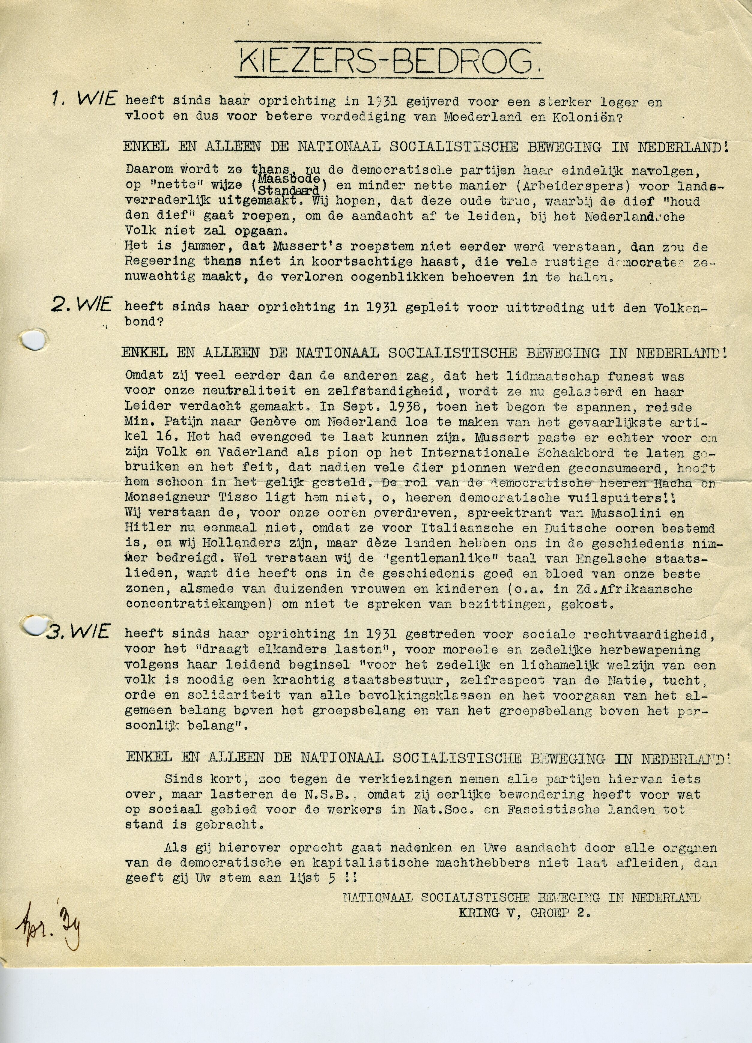 Pamflet van de "Nationaal Socialistische Beweging in Nederland Kring V, Groep 2." onder de kop: "Kiezers-Bedrog".