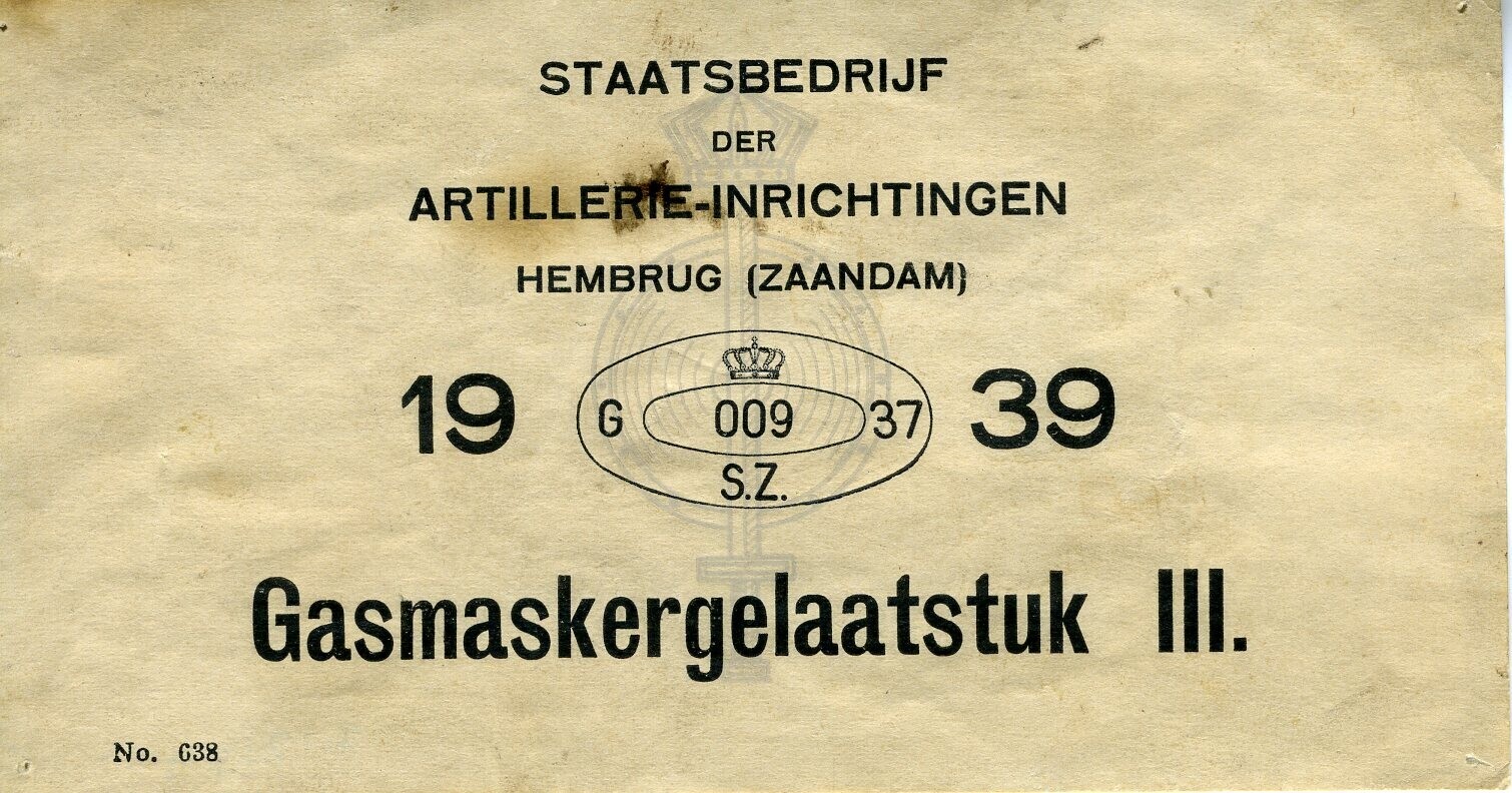 Een vignet met de tekst in druk: "Staatsbedrijf der artillerie-inrichtingen Hembrug (Zaandam) 1939 Gasmaskergelaatstuk III". In het midden een logo met daarop in ovalen: cijfers, letters en een kroon.