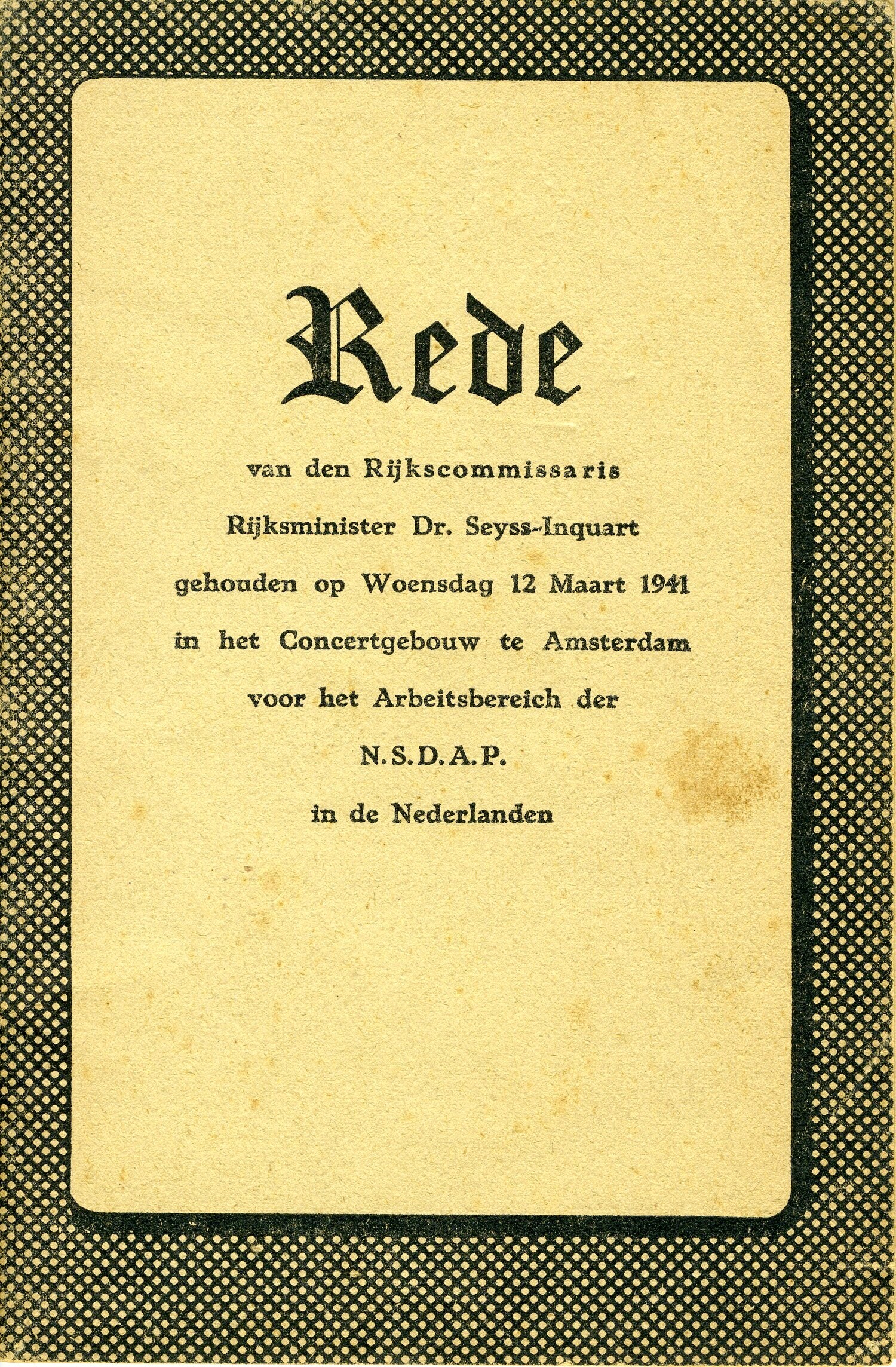 Boekje met een toespraak van Seyss-Inquart, gehouden op woensdag 12 maart 1941 in het concertgebouw Amsterdam voor het ''Arbeitsbereich der N.S.D.A.P.'' Het boekje omvat 31 pagina's.