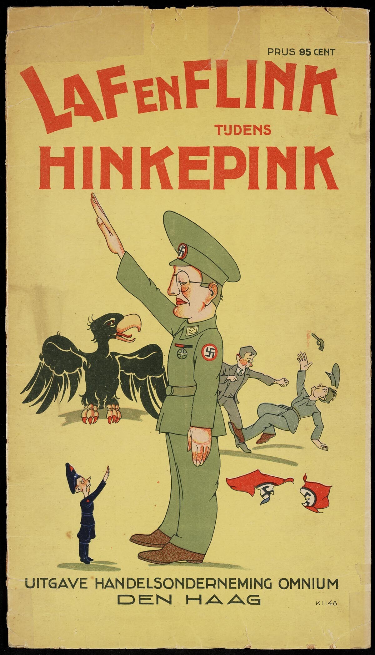 Een gezelschapsspel in een omslag met de titel "Laf en Flink tijdens Hinkepink" met karikatuur van Seys-Inquart.