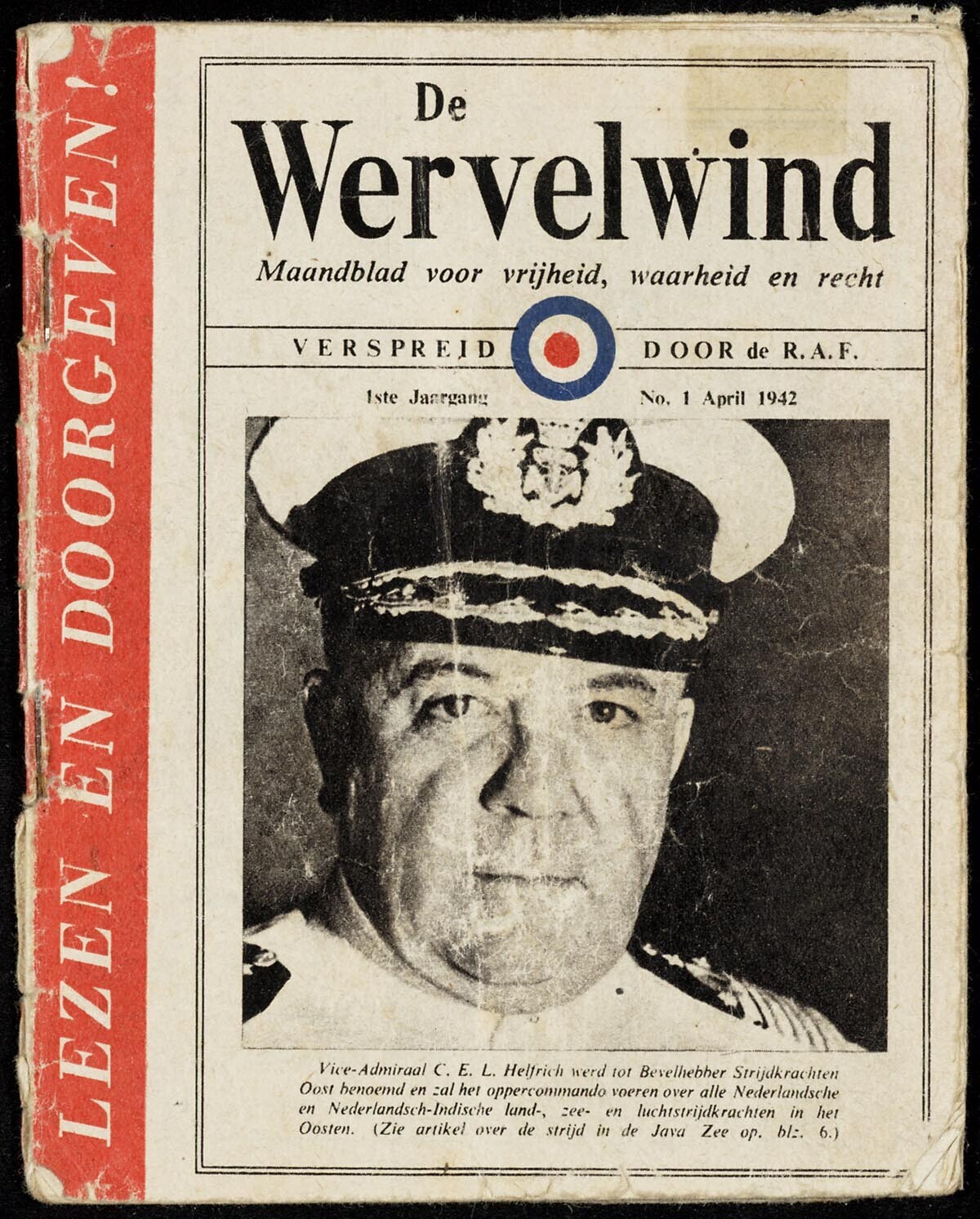 Editie van het tijdschrift "De Wervelwind. Maandblad voor Vrijheid, Waarheid en Recht. Verspreid door de R.A.F.", 1ste Jaargang no. 1 April 1942.
