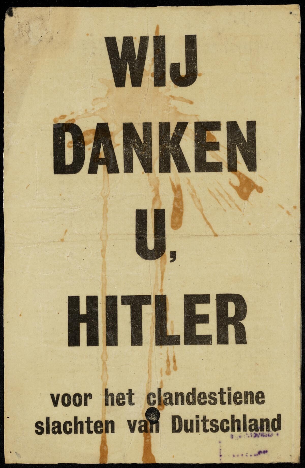 Geallieerd Nederlandstalig pamflet met de titel: "Wij danken u, Hitler voor het clandestiene slachten van Duitschland".