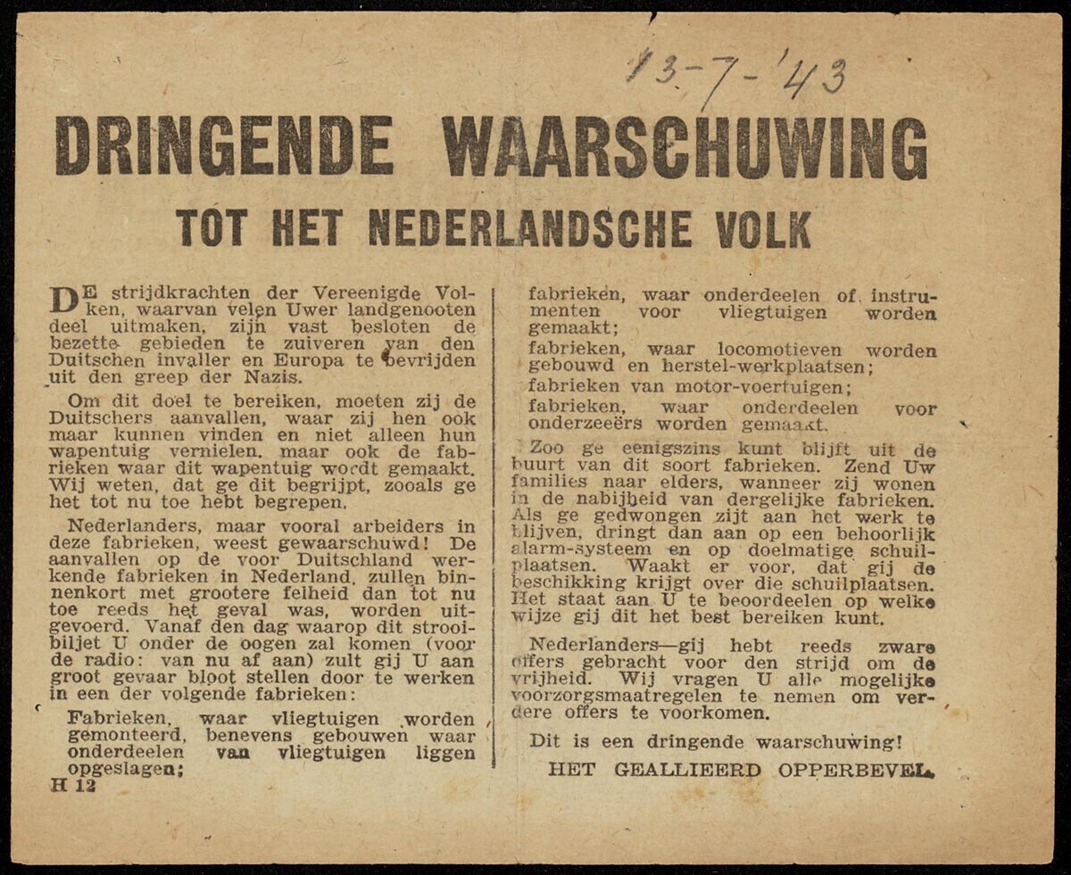 Twee exemplaren van een geallieerd Nederlandstalig pamflet met de titel: "Dringende waarschuwing tot het Nederlandsche volk", over de verzwaring van luchtbombardementen.