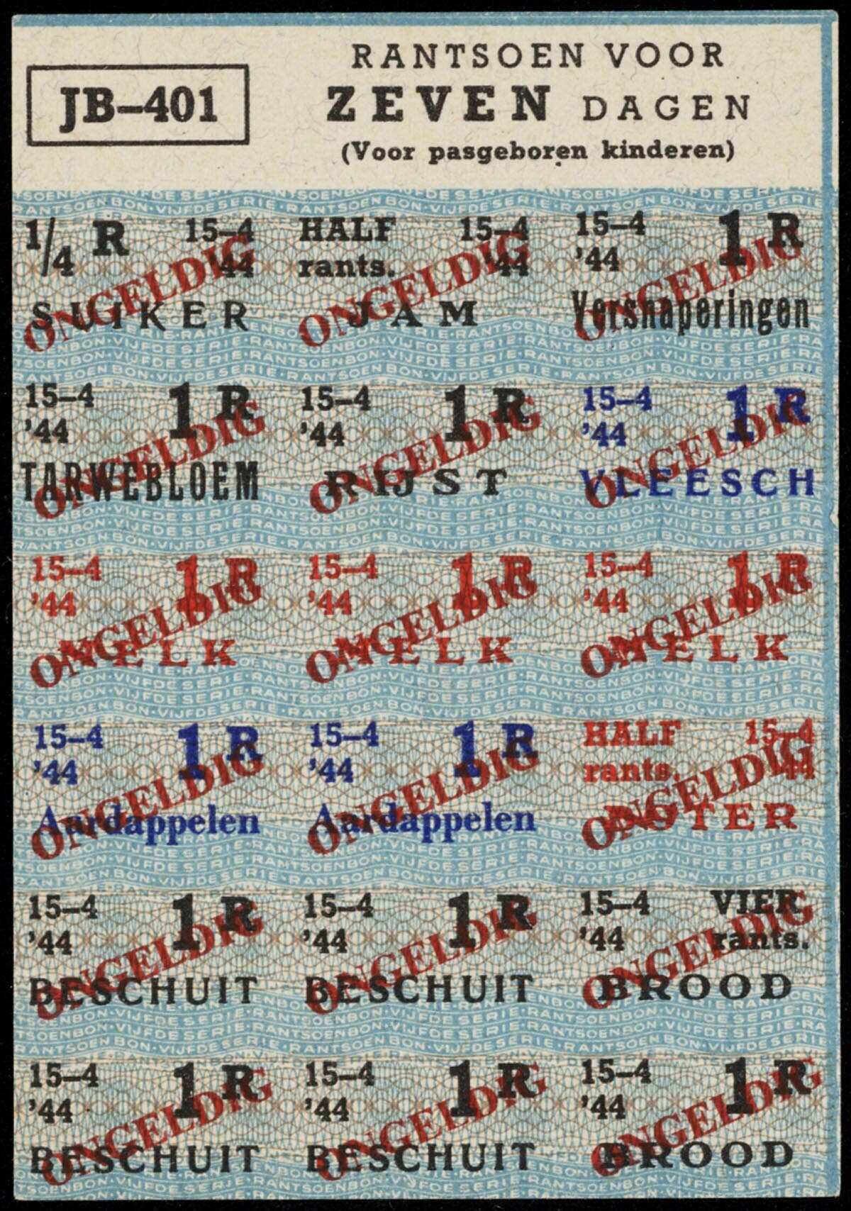 4 vellen met bonnen voor suiker, jam, versnaperingen, tarwebloem, rijst, vlees, melk, aardappelen, beschuit, brood, kindermeel en boter. De vellen zijn genummerd:<br>- JB-404 Rantsoen voor ZEVEN dagen (voor pasgeboren kinderen) 8-7 '44;<br>- JB-401 Rantsoen voor ZEVEN dagen (voor pasgeboren kinderen) 15-4 '44;<br>- JB-407 Rantsoen voor ZEVEN dagen (voor pasgeboren kinderen) 30-9 '44;<br>- JB-407 Rantsoen voor ZEVEN dagen (voor pasgeboren kinderen) 30-9 '44;<br><br>