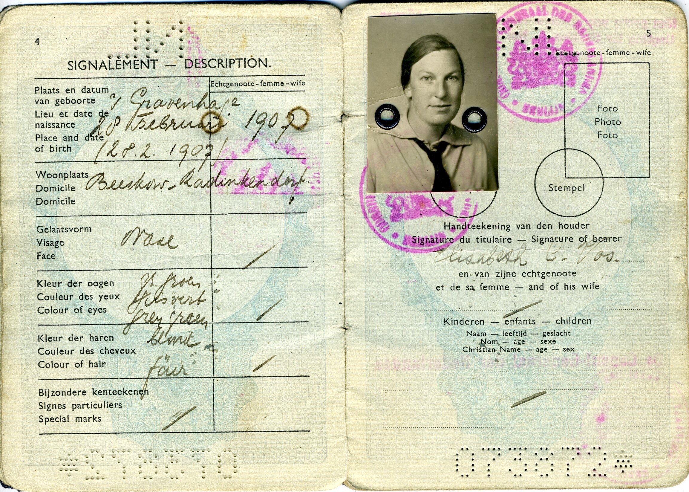 Een Nederlands paspoort op naam van Elisabeth Cornelia Vos met stempels, waaruit blijkt, dat zij regelmatig in Duitsland verbleef. Op pagina 17, 19 en 29 staan stempels van het Crisis- en Distributiekantoor 's-Gravenhage met de aangegeven rantsoenen.