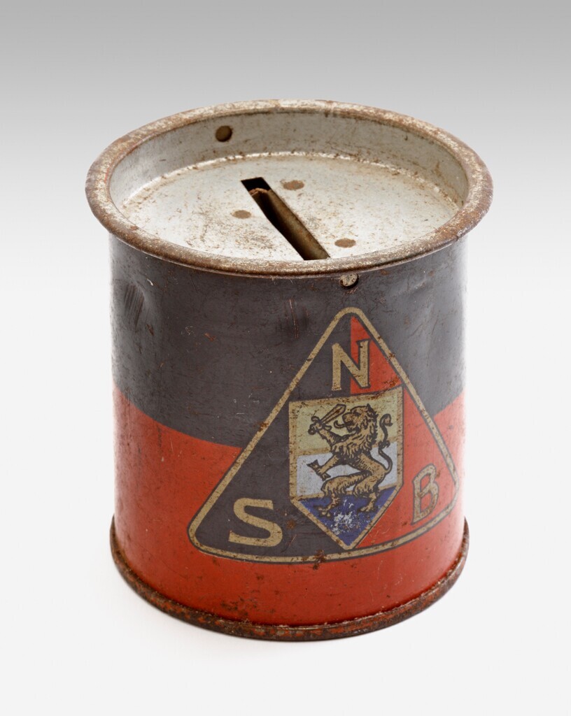 Een ronde blikken collectebus in de kleuren zwart en rood met het logo van de N.S.B.: binnen een driehoek met de gouden letters N.S.B. op een zwart met rood veld het wapenschild met de klimmende Nederlandse Leeuw tegen de achtergrond van de kleuren van de prinsenvlag: oranje, blanje, blue.
