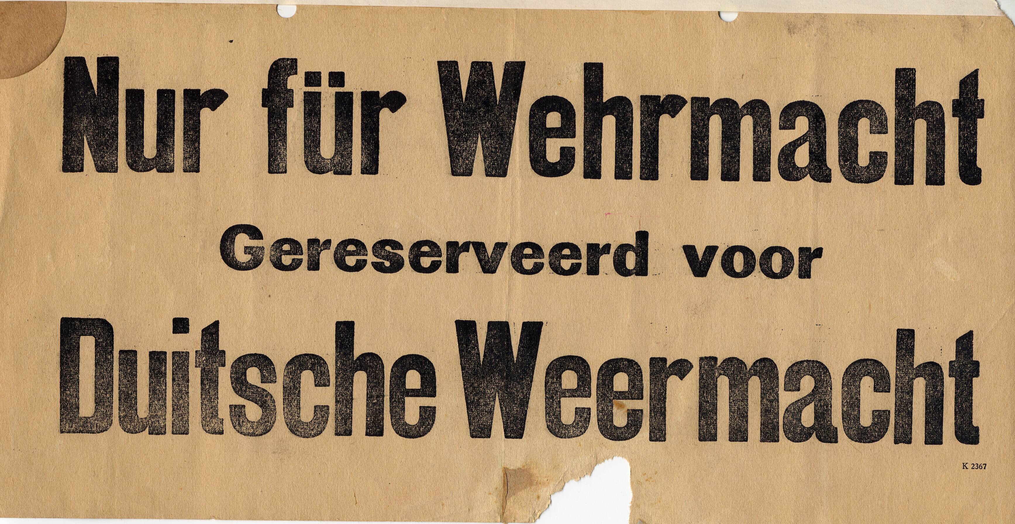 Een aanplakbiljet met daarop aan beide kanten in zwarte letters gedrukt: 'Nur für Wehrmacht. Gereserveerd voor Duitsche Weermacht'.