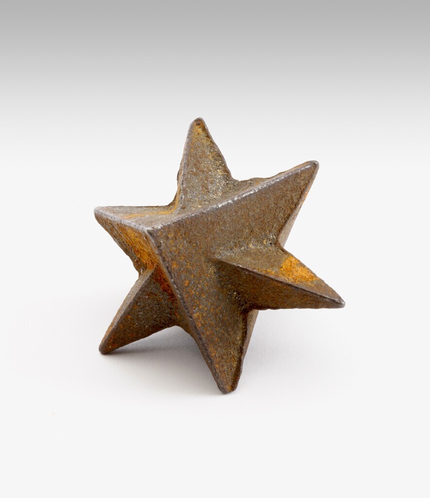 Een metalen kraaienpoot met acht punten. Dergelijke kraaienpoten werden op de weg gestrooid om doorgaand verkeer te belemmeren, aangezien de kraaienpoten de banden aan flarden scheuren.