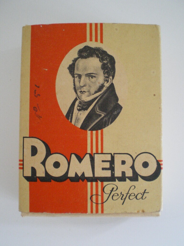 Een geel kartonnen pakje met over de helft van het pakje van boven naar onder een oranje band. In het midden op de voorkant een protret van een man in negentiende eeuwse kleding. Hieronder: "Romero Perfect". Op de zijkant in oranje: "10 sigaren".