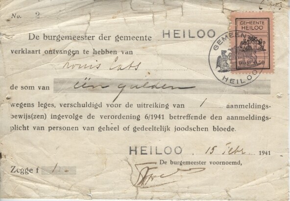 Een kwitantie uitgeschreven en ondertekend door de burgemeester van de gemeente Heiloo, waarin deze verklaart van Louis Cats de som van één gulden ontvangen te hebben aan leges, verschuldigd voor de uitreiking van een aanmeldingsbewijs als gevolg van de "verordening 6/1941 betreffende den aanmeldingsplicht van personen van "geheel of gedeeltelijk joodschen bloede".