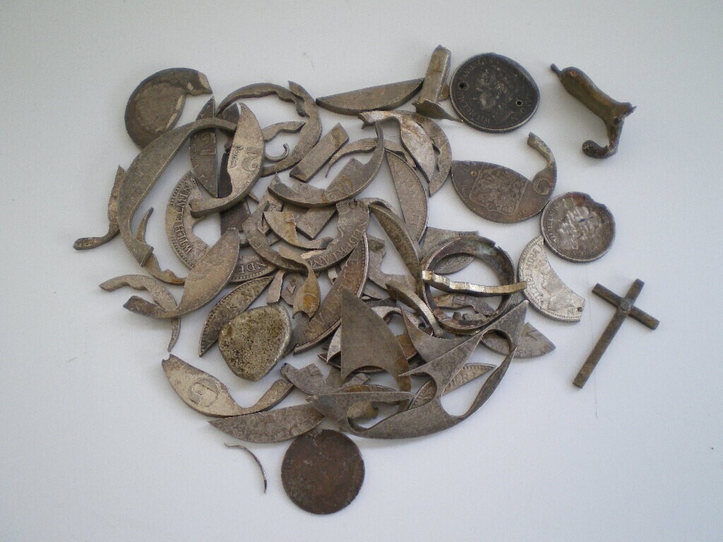 66 stukjes metaal o.a. bestaande uit verknipte munten, hele munten een stukje van een metalen klerenhanger en een metalen kruisje.
