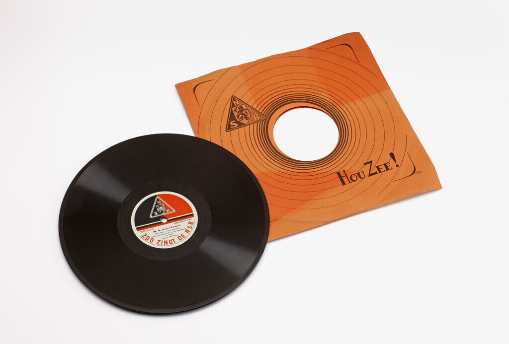 Een grammofoonplaat in opdracht van de N.S.B. gemaakt door “Telefunkenplatte.M.B.H. Abtlg Spezialaufname, Berlin". De 78-toerenplaat steekt in en roodroze hoes met op de voorkant het logo van de N.S.B. en "Houzee!" in zwart gedrukt met onderaan "v.d. Poll". Op de achterkant van de hoes welke platen nog meer zijn verschenen in "deze serie".<br>Op de plaat een rond label in wit, rood en zwart met het logo van de N.S.B. en: "80022 B.I.E.M. NSB 1001 (t70359) Zoo zingt de NSB. Hergestellt von der Telefunkenplatte.M.B.H. Abtlg Spezialaufname, Berlin".<br>Op één kant: "Dietschland, ontwaakt. Piet Heins - J.A. van Kersbergen. Uitgevoerd door het W.A. koor Amsterdam met orkest. Leiding: Piet Heins". Op de andere kant: "W.A. marcheert. Piet Heins - Franz Bankman. Uitgevoerd door het W.A. koor Amsterdam met orkest. Leiding: Piet Heins.
