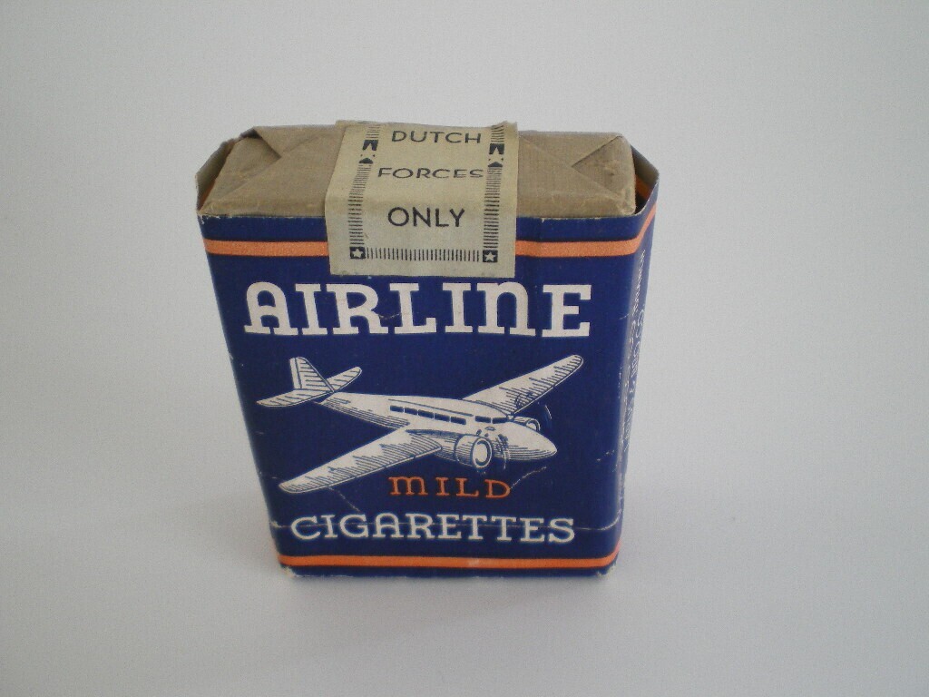 Een blauw papieren pakje met witte belettering. Op de voorkant de afbeelding van een vliegtuig en: "Airline mild cigarettes. Op één van de zijkanten "Reed Tobacco Co., Branch Larus & Bro.Co. Richmond, VA., U.S.A.". Op de andere zijkant een wetsartikel over het gebruik van dit tabaksprodukt. Op de achterkant: "Airline Cigarettes are blended to give you a smooth flight to a milder smoke. Het pakje is ongeopend met de banderol intact. Op de banderol: "For Dutch Forces Only".