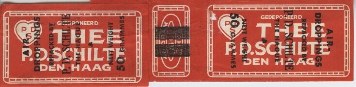 Een rood witte papieren verpakking met o.a.: "Gedeponeerd Thee P.D. Schilte Den Haag". Op de verpakking is een stempel met zwarte inkt gedrukt met o.a. de tekst: "Air-Droppings Repacked by P.D. Schilte The Hague".