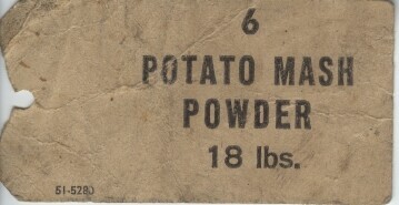 Een papieren label met in zwart gedrukt: " 6 Potato Mash Powder 18 Lbs. 51-5280". Het label behoorde bij goederen van een voedseldropping boven Nederland.