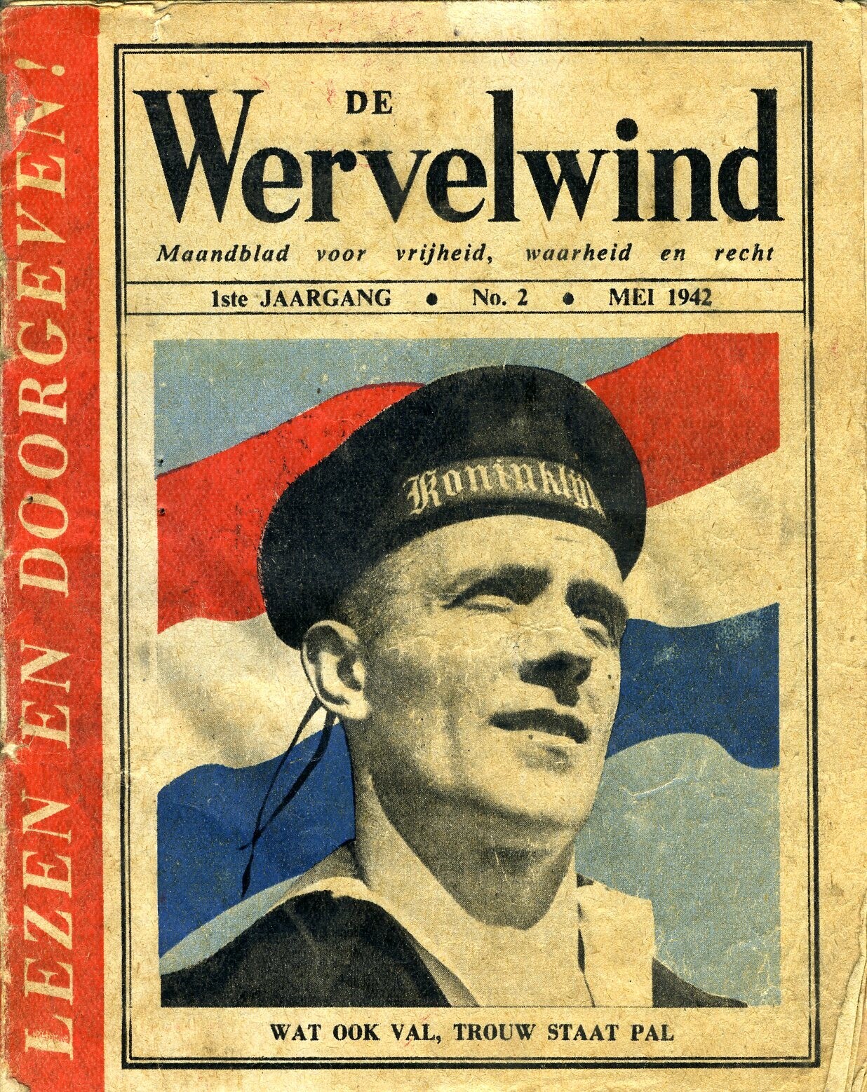 Editie van het tijdschrift "De Wervelwind. Maandblad voor Vrijheid, Waarheid en Recht. Verspreid door de R.A.F.", 1ste jaargang. no.2. Mei 1942. Wat ook val, Trouw staat Pal. Lezen en doorgeven. Op de achterkant is de Nederlandse leeuw afgedrukt met de tekst: "Verspreiding van deze artikelen in welken vorm ook dient de Nationale zaak". Het tijdschrift telt 31 pagina's. Het tijdschrift is een klein met zwart-wit foto's geïllustreerd drukwerk. Op de voorpagina een foto van een matroos van de Koninklijke Marine tegen de achtergrond van de wapperende Nederlandse vlag.