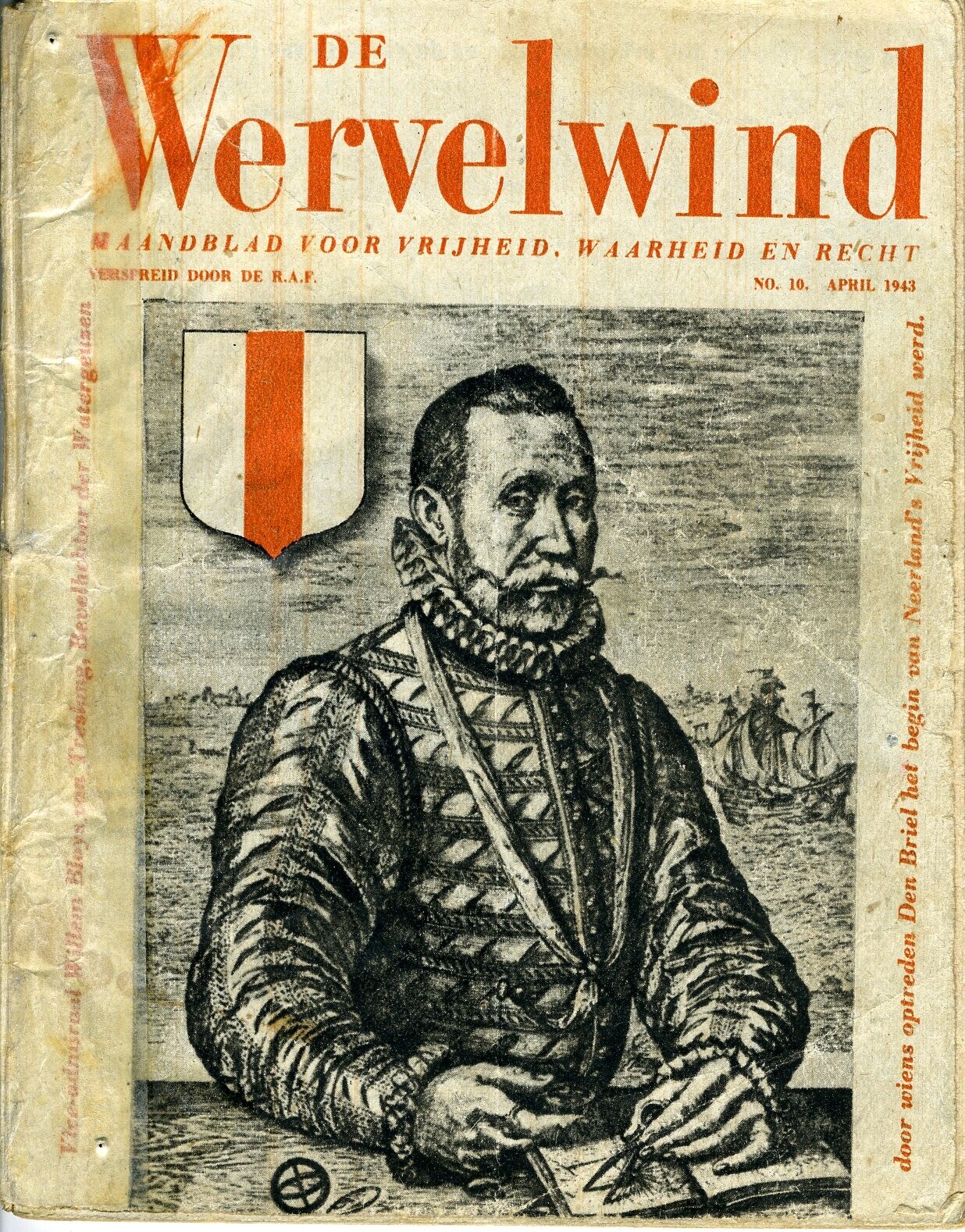 Een exemplaar van een klein met zwart-wit foto's geïllustreerd drukwerk. Op de voorpagina de afbeelding van een gravure van het portret van Viceadmiraal Willem Bloys van Treslong. Tevens de tekst: "De Wervelwind. Maandblad voor vrijheid, waarheid en recht. Verspreid door de R.A.F. No. 10 april 1943. Vice-admiraal Bloys van Treslong, bevelhebber der Watergeuzen door wiens optreden Den Briel het begin van Neerland's vrijheid werd". Op de achterkant o.a.: "Lezen en doorgeven!". Het tijdschrift telt 44 pagina's.