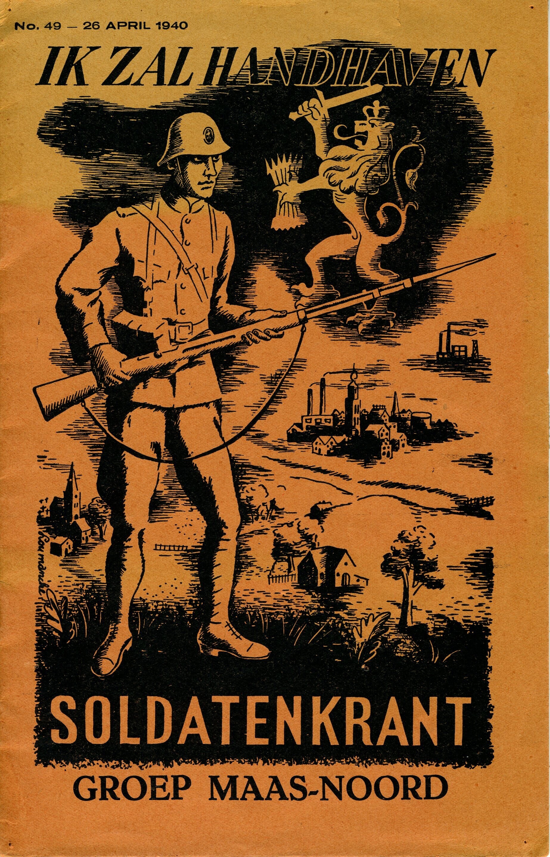 Een geïllustreerd blad met tekeningen en zwart-wit foto's. Op de oranje papieren kaft: "Ik zal handhaven. Soldatenkrant Groep Maas-Noord". Bovenaan: "No. 49 - 26 april 1940" en de afbeelding van een soldaat tegen een achtergrond met dorpen, steden, boerderijen en fabrieken. Daarboven een klimmende Nederlandse leeuw.
