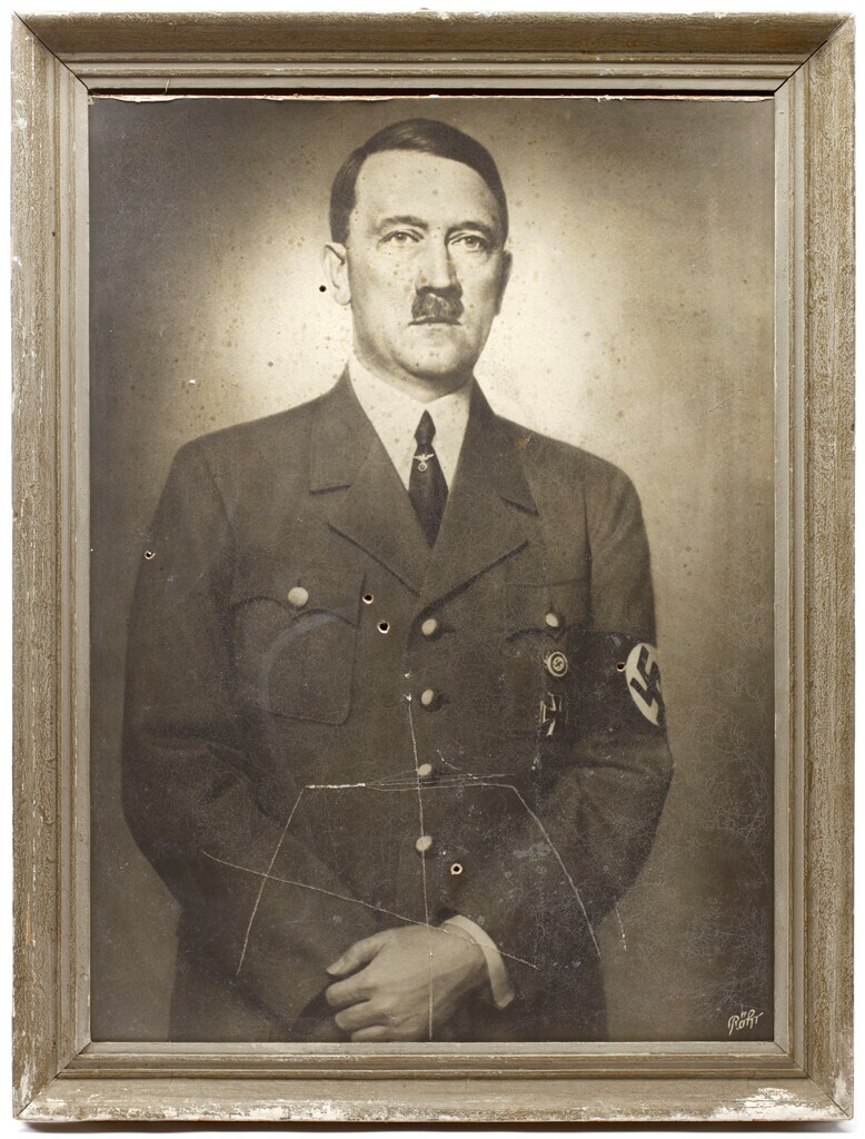 Een ingelijste zwartwit foto van Adolf Hitler. De foto is beschadigd door messteken en/of kogels.