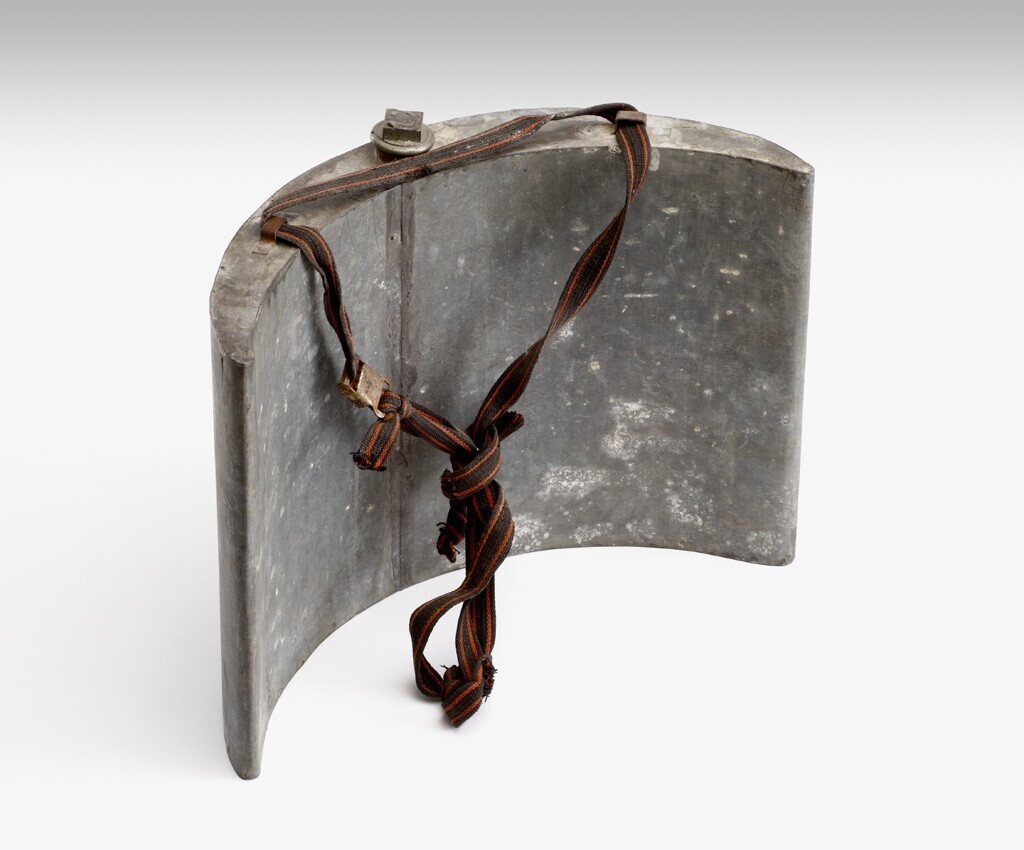 Een halfronde metalen smokkelketel voor melk. Aan de ketel zijn rood met zwarte draagbanden van textiel bevestigd.