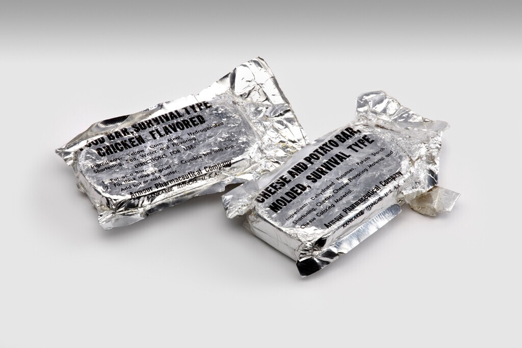Vijf noodrantsoenen met als opschriften: "Cheese and potatoe bar; Food bar; soup and gravy base; coffee instant type II; sugar granulated" van "Armour Pharmaceutical Company, Kankakee, Illinois, U.S.A."