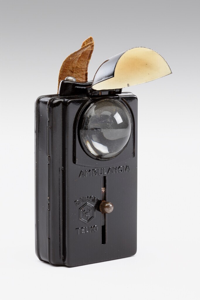 Een zwart metalen zaklantaarn met over de lamp een naar boven opklapbaar halfrond dekseltje, waardoor het licht van boven wordt afgeschermd. Op de voorkant is onder de lamp een schuif aangebracht. Met de schuif kan een plaatje naar boven voor de lamp worden geschoven, zodat de lichtbron ook op deze wijze kan worden afgeschermd.<br>Op de achterkant is een leren riempje bevestigd. Op de metalen kast van de lamp: "Ambulancia Daimon Telko" en een logo. Gebruikt door de Luftschutz en de Wehrmacht.